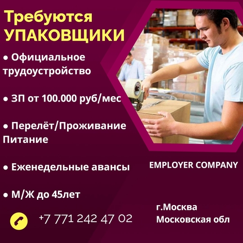 Требуются Упаковщики на склады. Работа в России вахтой для граждан Казахстана и Кыргызстана.