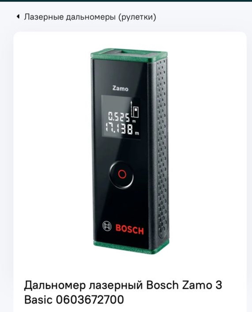 Продам лазерный дальномер Bosch ZAMO 3 BASIC. Новый, В УпаковкеРазумный Торг Уместен !!!Бренд:BoschВес нетто:0.08 кгГабариты без упаковки (ДxШxВ):105x38x22 ммДиапазон температуры эксплуатации:от -10 до +40 °CКласс лазера:2Количество точек начала отсчета:1Макс. дальность измерения:20 мМакс. длина волны:635 НмНаличие Bluetooth:нетНаличие поверки:нетПогрешность:± 3 ммЭлементы питания:2x1.5В/AAA/мизинчиковая(R03; LR03; FR03)Возможность вычисление углов:даВозможность измерения объёма:даВозможность измерения площади поверхности:даВозможность непрерывного измерения:даСкачать инструкциюДальномер лазерный Bosch Zamo 3 Basic 06******00 - используется для измерения расстояний до 20 метров. Имеет следующие функции: расчет площади и объема, непрерывное измерение, измерение длины и т.д. Полученные данные отображаются на легко читаемом дисплее. Управление осуществляется всего одной кнопкой, что значительно упрощает эксплуатацию прибора. Новый интерфейс позволяет объединить ленточный, колесный и линейный адаптер, которые приобретаются отдельно.