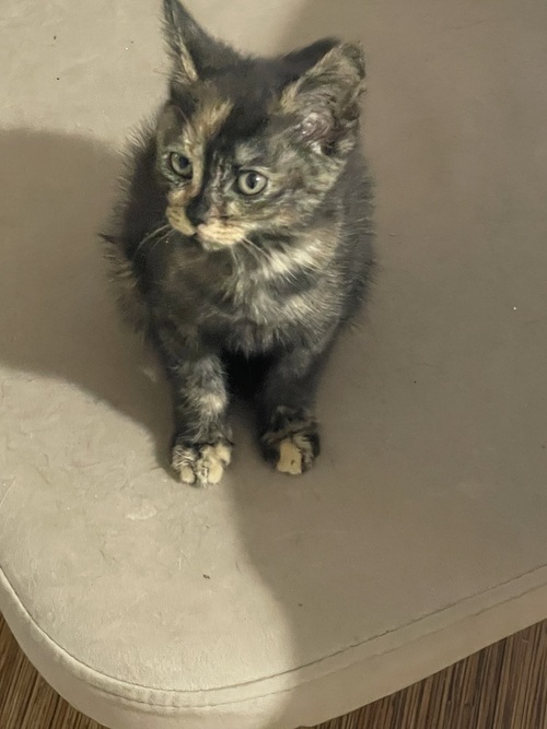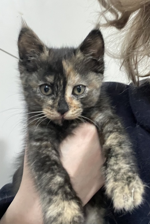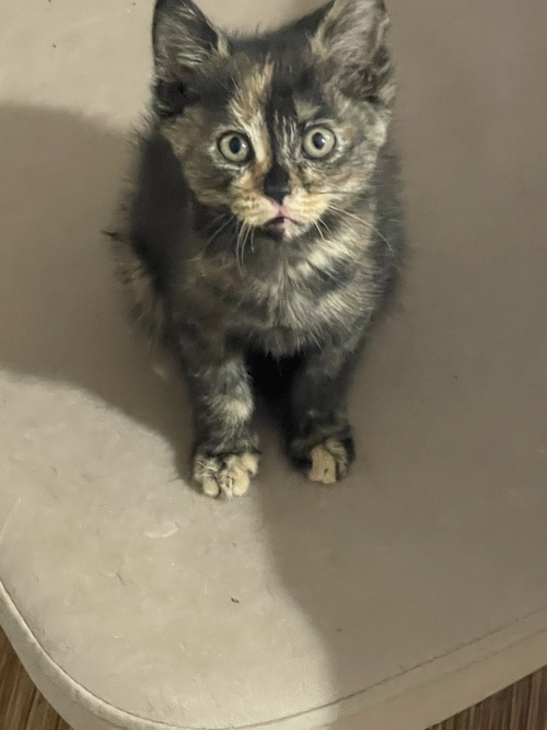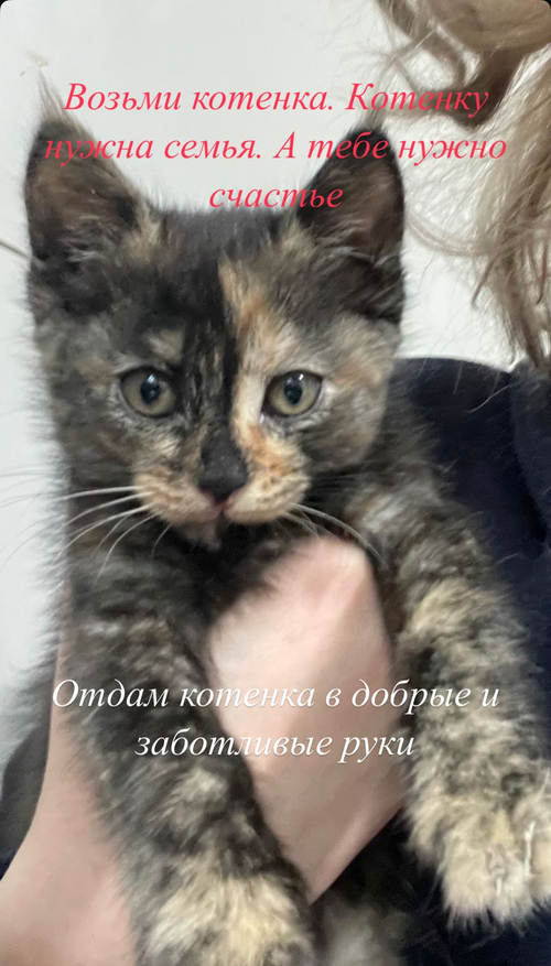 Отдам котенка в добрую и заботливую семью. Возраст 1,5 мес. Окрас черепашка- трехцветная. Девочка. Лоток знает. Ест сухой/влажный корм.