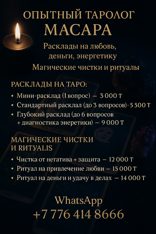 Мини-расклад (1 вопрос) — 3 000 ₸Точный ответ на ваш вопрос, краткий анализ ситуации и совет.Стандартный расклад (до 3 вопросов) — 5 500 ₸Глубже разбираем личную или финансовую ситуацию. Получаете чёткое понимание происходящего и перспектив.Глубокий расклад (до 6 вопросов + диагностика энергетики) — 9 000 ₸Расклад для тех, кто хочет изменений: определим корень проблем, внутренние блоки и пути выхода.Срочный расклад (в течение 1 часа) — +2 000 ₸ к любой услуге ОБРЯДЫ И РИТУАЛЫ:Чистка от негатива / сглаза / зависти + защита — 12 000 ₸Мягкое и эффективное очищение, которое вернёт вам силы, спокойствие и защиту от завистливых людей.Ритуал на привлечение любви и внимания — 15 000 ₸Открываю поток любви, усиливаю женскую или мужскую привлекательность, снимаю внутренние блоки.Ритуал на деньги и удачу в делах — 14 000 ₸Притягиваю финансовые возможности, клиентов, успех в работе и бизнесе. Помощь особенно сильна перед важными событиями.Создание и активация амулета на успех / защиту — от 10 000 ₸Индивидуальный амулет по вашей дате рождения: на деньги, защиту, любовь или энергию. Заряжаю на результат.После оплаты — работа начинается сразу. Предоставляю фотоотчёты по ритуалам.Пишите прямо сейчас — и начнём менять вашу реальность.