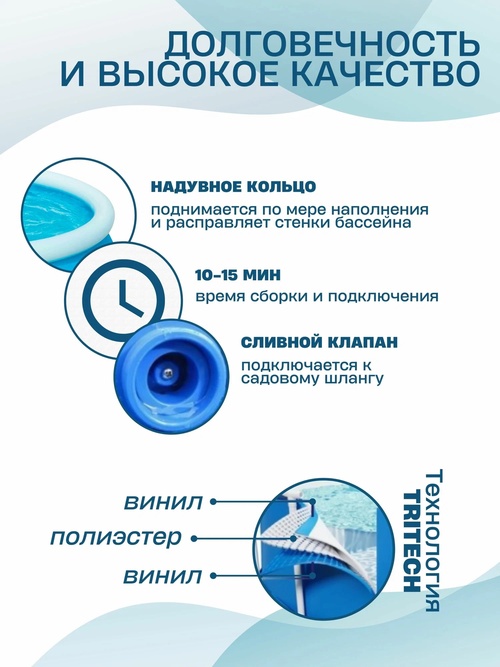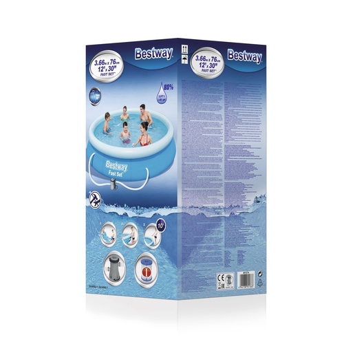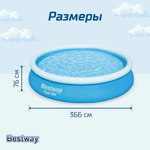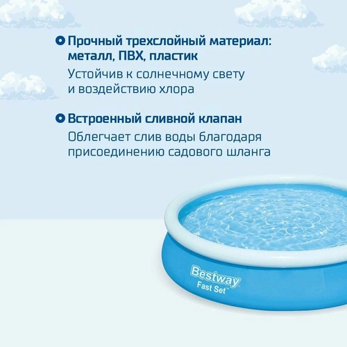Надувной бассейн Bestway Fast Set отличается простотой и легкостью. Стенки бассейна, выполнены из армированного ПВХ, внешний слой - полиэстер для особой прочности.Поддержка бортов осуществляется при помощи надувного кольца, которое поднимается по мере наполнения бассейна и расправляет его стенки.Для установки бассейна нужна плоская, горизонтальная площадка. Время сборки и подключения бассейна не более 10-15 минут. На холодное время года не рекомендуем оставлять бассейн на открытом воздухе.Удобный сливной клапан позволяет присоединить садовый шланг, что дает возможность слить воду в любое место.В комплекте имеется все необходимое для дальнейшего пользования бассейна, в том числе и фильтр-насос для наполнения и рециркуляции воды в бассейне.
