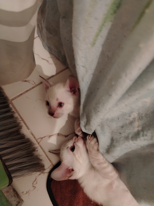 Котятам 2 месяца, голубоглазые, белые в рыжий окрас, к лотку приучены, кушают сами.Оченб любопытные, Ласковые и игривые, котята помись бенгала и сервала